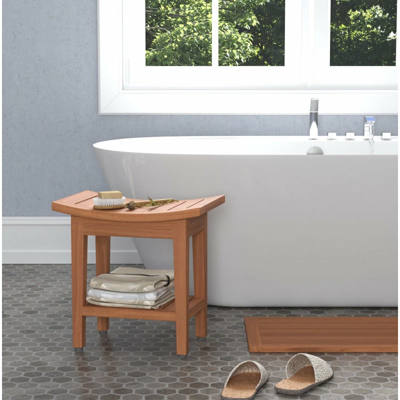 This OptiAREAโข space saving teak bath bench is a fantastic choice for any space. The compact design of this teak shower bench allows for both functionality and convenience, and includes a handy shelf for additional storage space. This teak shower seat also features adjustable rubber padded feet for safety and stability in any location! Naturally water resistant, the teak shower stool is suitable for use both indoors and outdoors. Our teak wood is all sustainably harvested and environmentally friendly, and includes stainless steel hardware for added durability. We offer a 30 day satisfaction guarantee and 5 year warranty on all of our products! (Some assembly required)