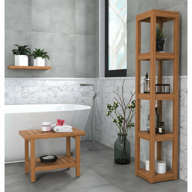 This teak shower bench will blow you away with its high quality and aesthetic appeal. Handcrafted with farm-grown, sustainably-harvested teak wood, this AquaTeakยฎ teak shower seat is the ideal accessory for your bathroom, patio, or poolside. Convenient for use as a teak bath stool as well, this durable product comes with all stainless steel hardware and is naturally water resistant. Perfect for any area of your home or garden, we are so confident that you will love your teak shower bench that we offer a no-hassle, 30-day guarantee and a 5-year warranty on this and all of our teak furniture products! (Some assembly required)