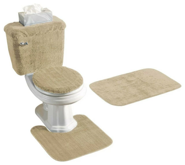 One 5 piece lightweight rug set that includes an area rug (20″ x 30″), a contour rug (20″ x 20″), a tank cover, a tank lid and a standard size lid cover. The rugs have a non skid rubber back.