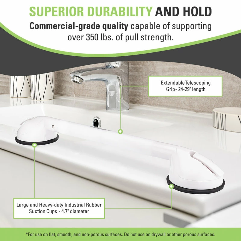 The Telescoping Portable Suction Grab Bar offers a unique extendable handle that allows the Portable Suction Grab Bar to lengthen and shorten as necessary to adjust to the specific needs of the user. The Telescoping Portable Suction Grab Bar comes available in two sizes to accommodate practically any need and the high quality, 4.7″ diameter suction cups offer the strongest and most reliable hold on the market today.