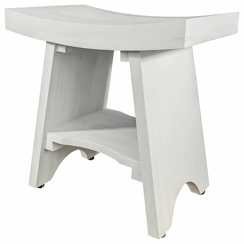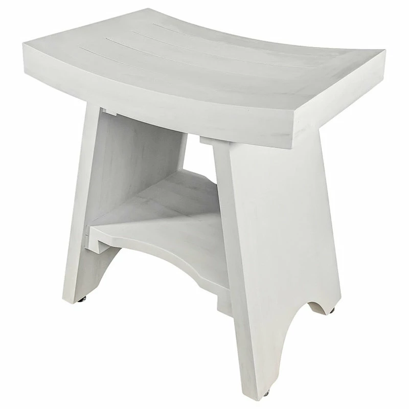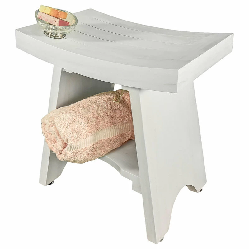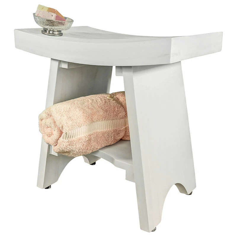 Our fully assembled Serenity shower bench design provides a stunning new modern style, combined with improved features and functionality. Flared legs provide extra stability and support, preventing tipping. Adjustable height foot pads provide improved safety, allowing leveling on sloped shower floors. CoastalVogue solid teak Serenity Eastern style 18″ teak shower bench with an included storage shelf at no extra charge, provides a classy Zen-like feel to your shower, bathroom, living room, or patio, hence the name Serenity. This teak shower bench has an included convenience shelf which gives added versatility for storage of toiletries, books, or other essentials. It has a compact footprint of 18″ long, and 12″ wide, with a comfortable height of 18″. It is the perfect height to rest your feet on while shaving in the shower. CoastalVogue teak breaks new ground in innovative teak design décor. The CoastalVogue Driftwood finish is slightly rustic with a very subtle distressed finish and is suitable for indoor and outdoor use. CoastalVogue is a brand from a woman owned enterprise. CoastalVogue products are manufactured in small workshops on the island of Java in Indonesia. We work with local craft people that have often been making furniture, crafts, and wood carvings for multiple generations. We work directly with these small workshops which is why we are able to provide the USA consumer with such an incredible value.
