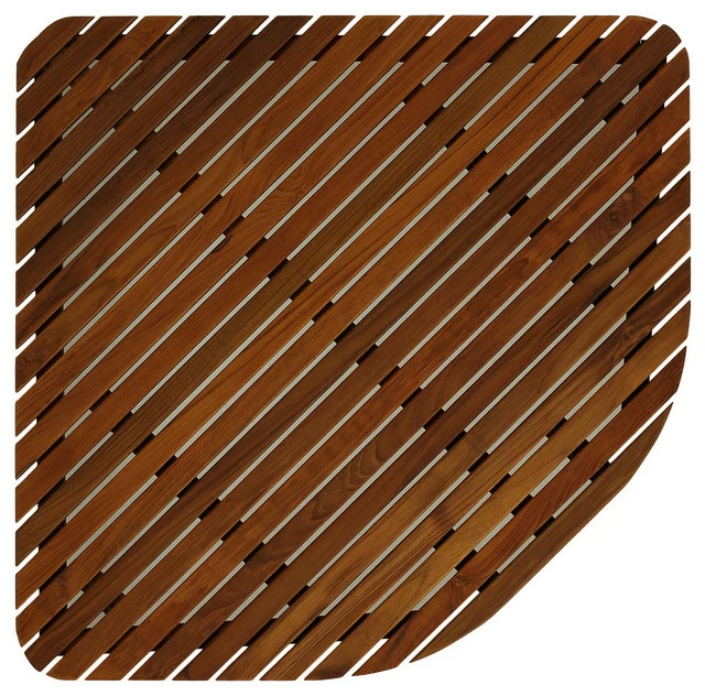 Escape from the ordinary with this X-large Erika teak corner shower mat. It will bring the feel of a tranquil spa right into your home. Made of responsibly harvested solid teak wood (tectona grandis), it is naturally resistant to mold and mildew. This mat is made of premium solid teak wood and comes in an oiled finish. Perfect for a corner space outside your sauna, pool, spa, shower, bathroom, deck, boat or RV and will keep your feet warm while providing a clean slip resistant surface. Measures 30″ x 30″ with one softly rounded corner. The slats are 1.25″ wide and it is 1.5″ off the floor.