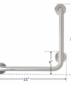 The satin finish on this L-shaped left-handed grab bar is easy to clean. Twist-on flanges conceal screws and provide a clean finished look. Our safety bar complies with all ADA standards and stands 1.5″ from the wall, providing an easily accessible grip all around.