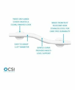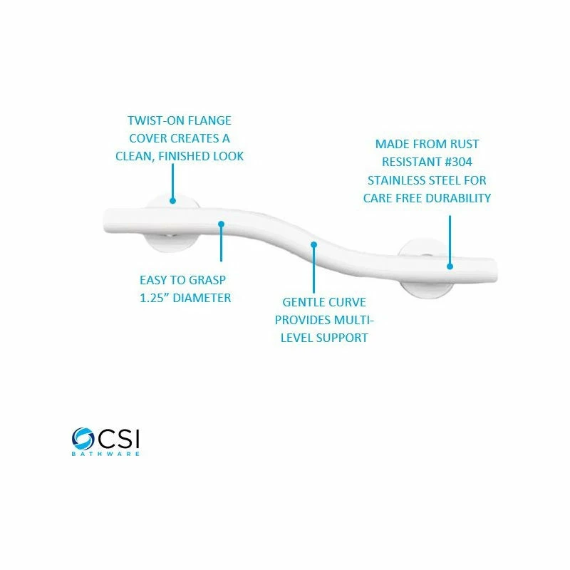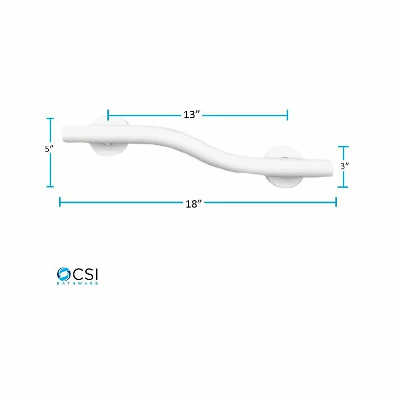 The CSI Bathware Right Wave Shaped Grab Bar provides a stylish alternative to the standard grab bars readily available in todayβs market. The gentle wave shape provides sturdy, multi-level support and matches seamlessly with our left hand version to provide multi-wall support. With a stylish finish and supportive design, this ADA compliant grab bar supports up to 500 pounds, accommodates a wide variety of abilities and blends seamlessly with almost any decor. Each grab bar includes the necessary mounting hardware that allows for easy, secure installation. And thanks to its durable care free construction, this grab bar will provide lasting performance year after year.