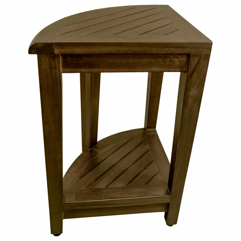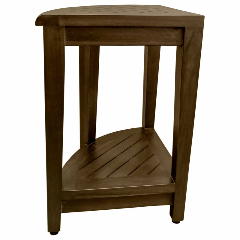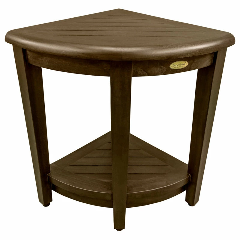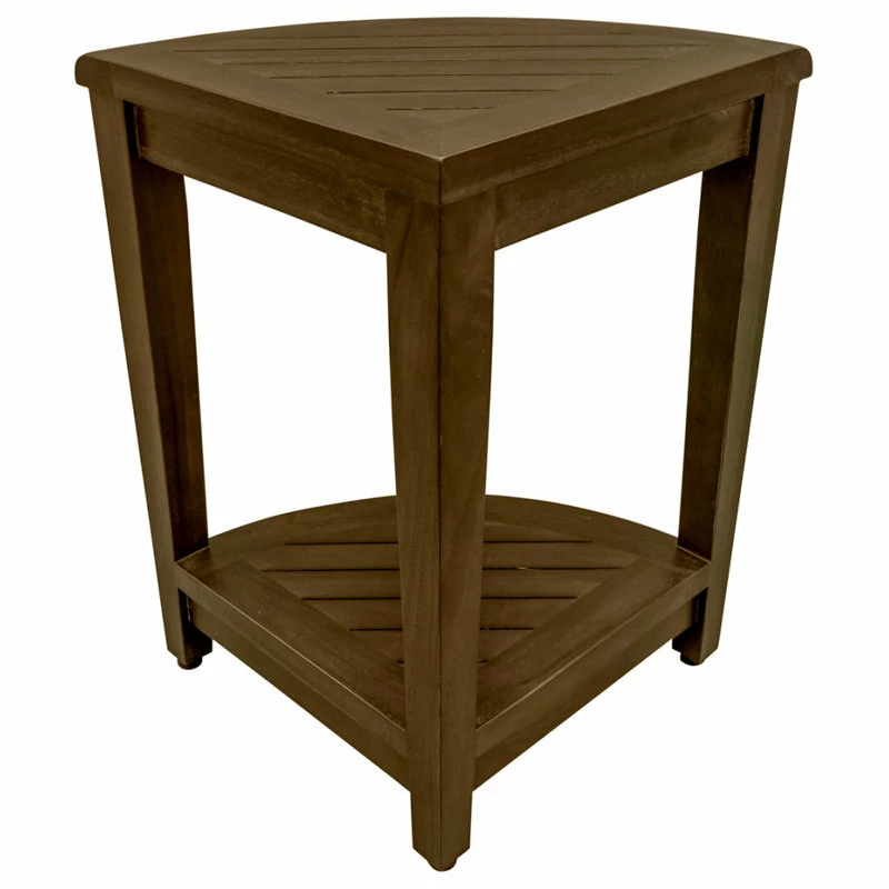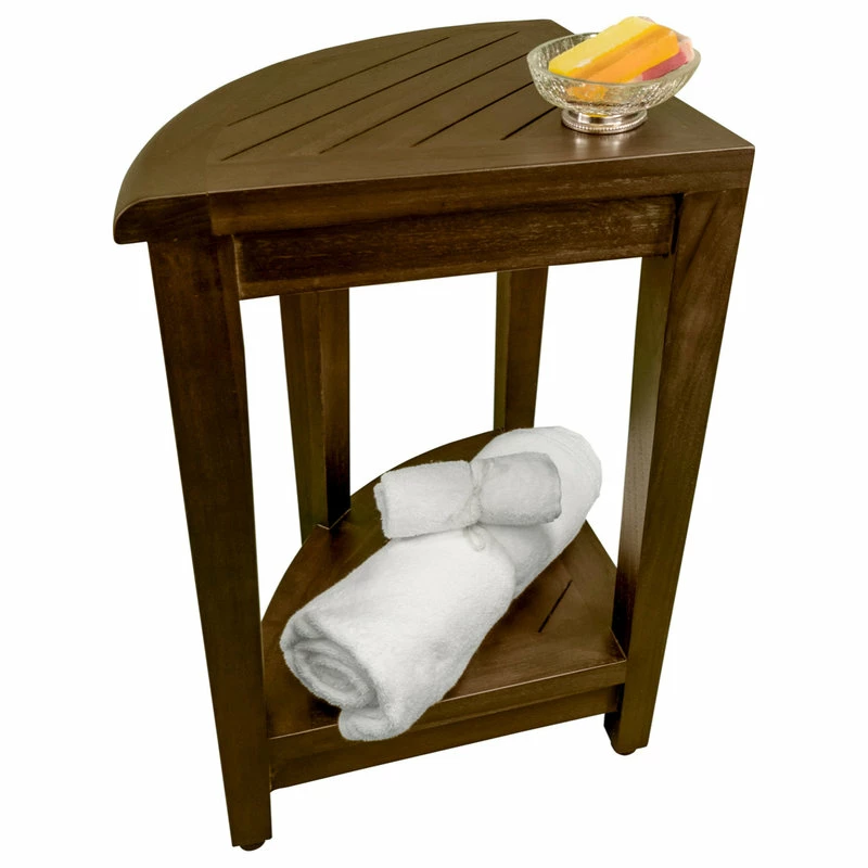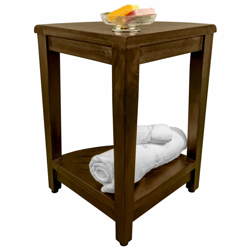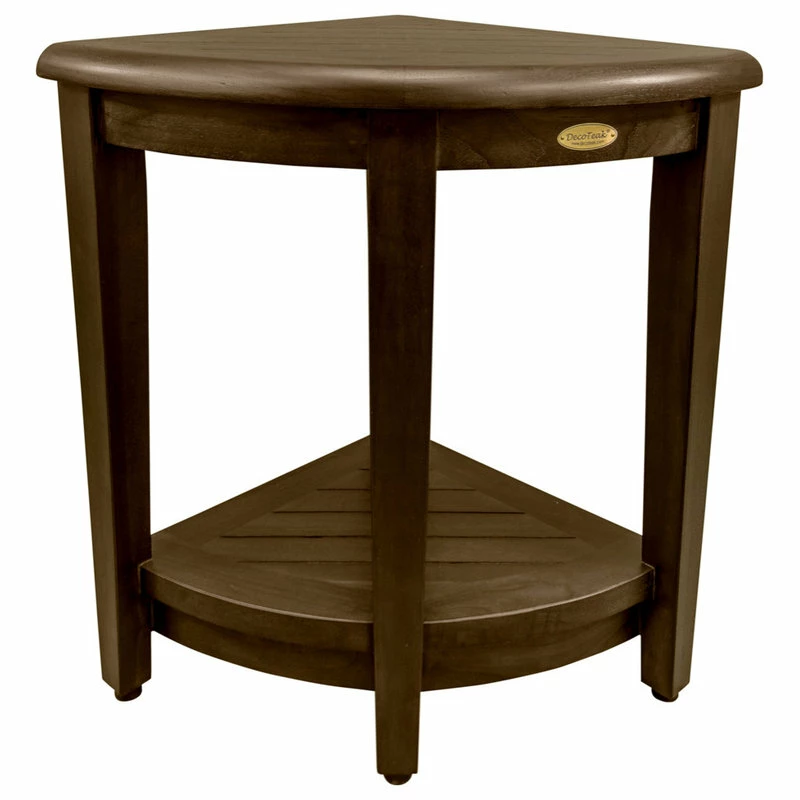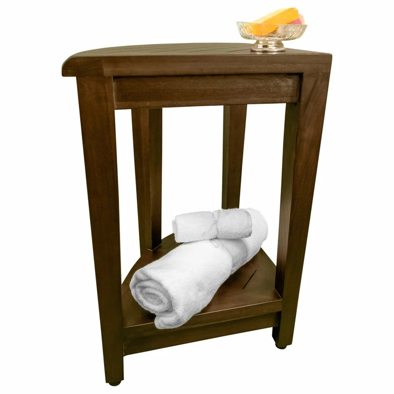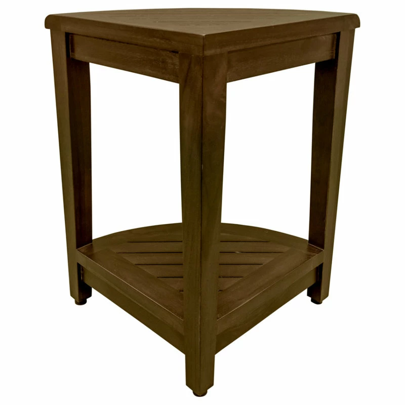 The Deco Teak FULLY ASSEMBLED teak corner shower stool is a great choice to provide the maximum seating and storage capacity with the minimum space utilization. FULL ASSEMBLY is included so all you do is take the product out of the box and place in your shower, bathroom, bedroom, or patio. The corner design will fit snugly in compact showers, while providing a full storage shelf for storing toiletries and other essentials. Its design provides a modern contemporary feel to enhance modern bathroom decor. Its solid teak construction is naturally water, mold, and mildew resistant. Our proprietary deep penetrating stain provides added durability and weather resistance. Our stain has mold, and mildew inhibitors and is appropriate for use outdoors as well as indoors. All of these stools come standard with leg levelers to aid in leveling the stools in showers that might have a slight slope, or on outdoor patios.