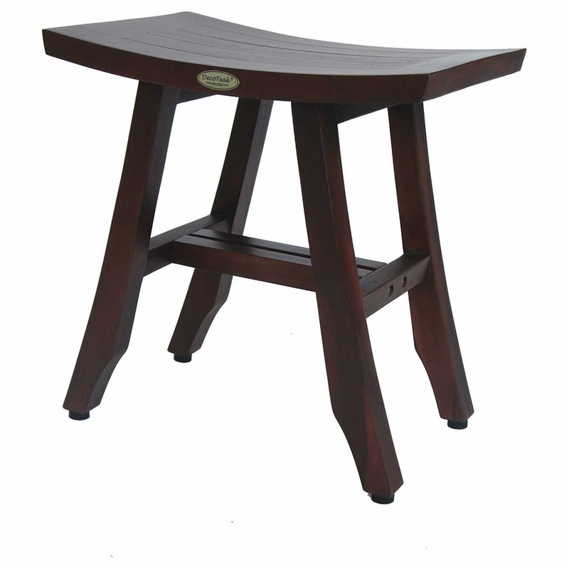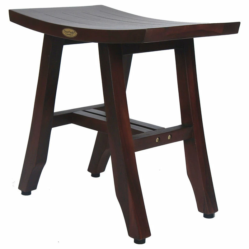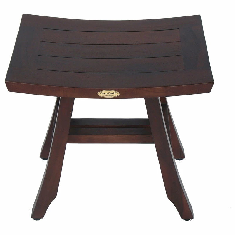 Compact Teak Shower Stool, the Satori model has a UNIQUE PATENTED DESIGN- (USPTO #D717,053). This teak shower stool will fit in small spaces but still be fully functional. It is the perfect height to use as a foot rest for shaving, but wide enough and sturdy enough to be a fully functional and comfortable seat. The rich brown indoor outdoor stain allows this to be used in the shower, anywhere in your house, or for outdoor living. The value of this for 100% solid plantation grown teak is unsurpassed and unbeatable. The teak shower stool’s included ADJUSTABLE HEIGHT foot leveler pads allow independent adjustment of each leg to make minor adjustments for slight slopes in shower floors. The rubber foot pads also provide an non-slip stable surface for extra stability. In addition the foot leveling pads raise the teak legs off the floor of the shower so that the wood does not stay in contact with water, or damp shower floor surfaces when not in use. This will help prolong the life of the teak. SOME ASSEMBLY REQUIRED- All tools, hardware and directions provided.