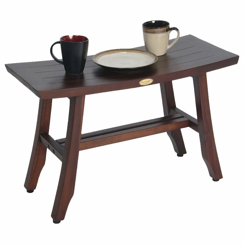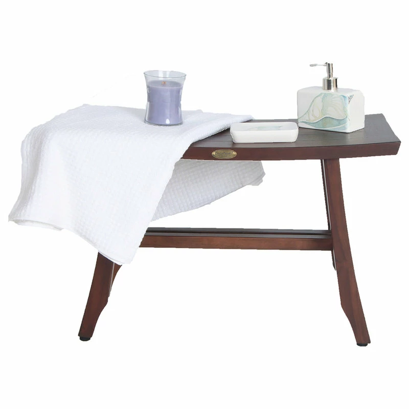 New patented (USPTO #D717,053), member of our five star rated Satori Eastern styled solid teak shower benches. The most economical 24Andquot; Eastern styled teak shower bench on the market. The popular five star rated Satori Eastern shower bench model has a full roomy seat length design of 24Andquot; that provides that a great design statement for larger showers. The 18Andquot; height is the perfect height to use as a foot rest for shaving, but wide enough and sturdy enough to be a fully functional and comfortable seating shower bench. The rich brown indoor outdoor stain allows this to be used in the shower, or anywhere in your house, or for outdoor living. The value of this for 100% solid plantation grown teak is unsurpassed and unbeatable. The included foot leveler pads allow independent adjustment of each leg to make minor adjustments for slight slopes in shower floors. The rubber foot pads also provide an non-slip stable surface for extra stability. In addition the foot leveling pads raise the teak legs off the floor of the shower so that the wood does not stay in contact with water, or damp shower floor surfaces when not in use. This will help prolong the life of the teak. SOME ASSEMBLY REQUIRED- All tools, hardware and directions provided.