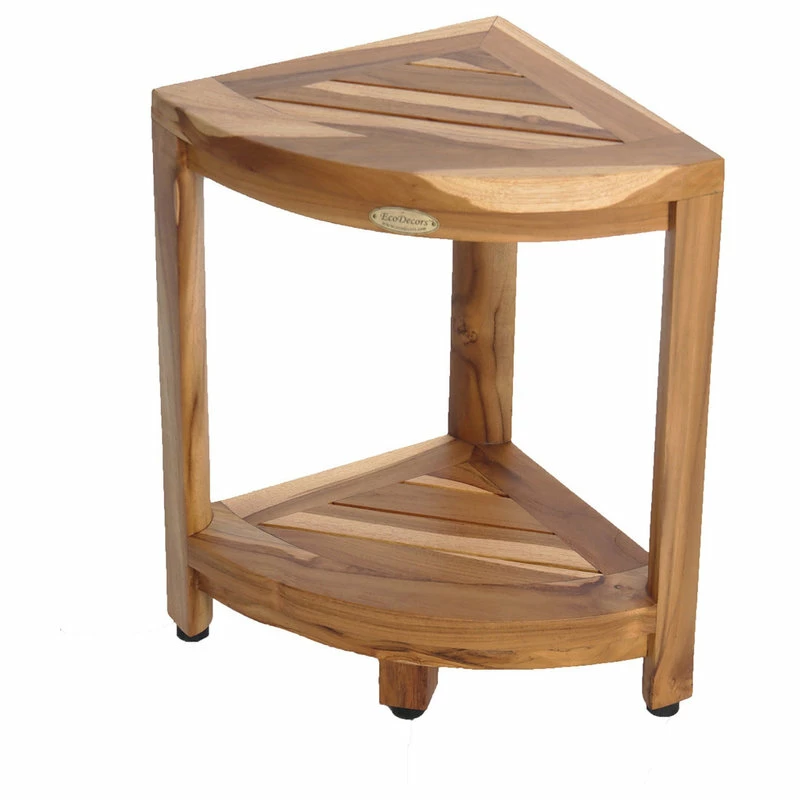 EcoDecors develops unique home decor & furnishings using recycled, reclaimed, and up-cycled materials. We focus on using materials that let the natural beauty of wood be highlighted included the beautiful natural wood grains, and coloring variations in teak that is naturally indigenous to the species. We have developed a coating process that both protects the wood, and brings out the natural grains and colors of the teak wood. Every EcoDecors furniture and accessory uniquely highlights its materials. EcoDecors is a small family owned and operated company priding itself on quality, value, and service. We source directly from small rural workshops in developing countries. Our craftspeople use artisan techniques handed down from generation to generation to craft cast off doors, old boats, buildings, brides, rail road ties, teak roots, and other material into one of a kind functional works of art. To assure our quality we employ our own inspection staff on site and also do 100% quality re-inspection in the USA. This corner traditional teak shower bench has a contemporary design flair. These stools include foot leveling pads to provide extra flexibility and stability to allow stabilization due to any minor slope and uneven surface such as shower floors. Teak is naturally water, mold, and mildew resistant due to its natural density and high oil content. It has been the wood of choice for hundreds of years for luxury boat builders. This natural resistance has been supplemented by using our proprietary EcoDecors sealer which is a deep penetrating stain with added mold, mildew, and fungus inhibitors. It provides the ability for this teak furniture to be used outdoors as well as indoors.