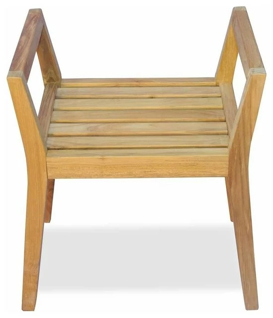 Teak Shower Bench with arms – great even if not used in a shower. Arms allow for extra support while getting up or sitting down. 26in H x 23 1/2in W x 17in D, seat height is 18in, seat area 16.5in x 17in