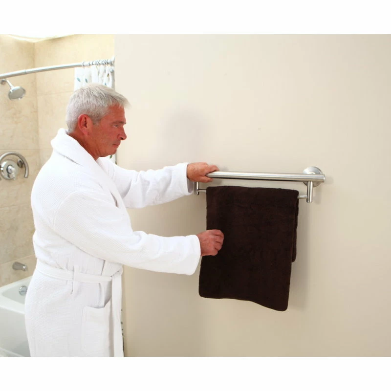 Grabcessories 2-in-1 Grab Bar Towel Bar prevents falls in a key “fall risk” zone of the bathroom – hanging towels, allowing a person to hold on while storing or retrieving the towel(s) on the cleverly integrated Towel Bar. This non-corrosive Stainless Steel Grab Bar has no-slip Rubber Grips, a Brushed Nickel finish and holds up to 500 lbs. The fixture?s beautiful, curved design is disguised to seamlessly integrate into your bathrooms’ decor while providing the convenience needed to live independently.