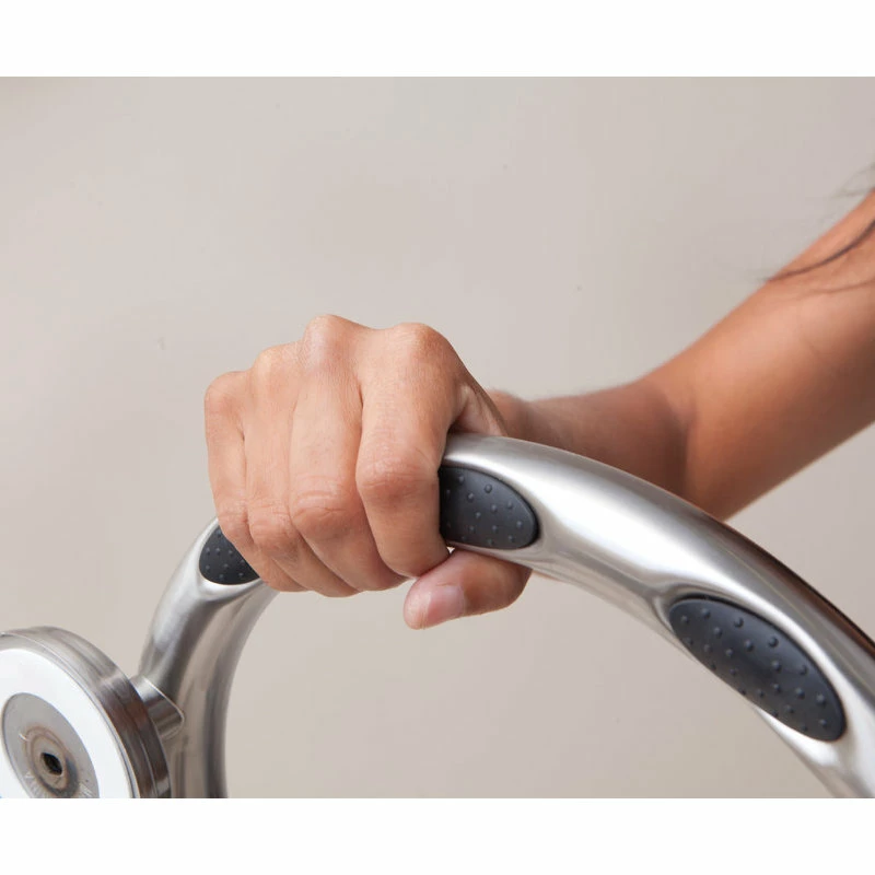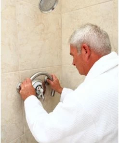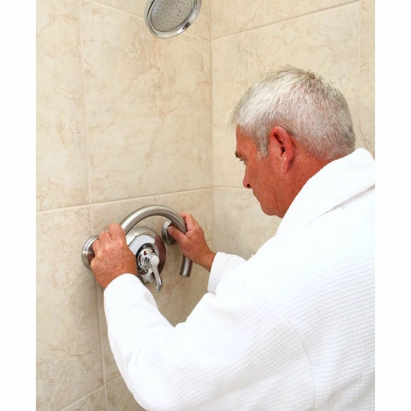 Grabcessories 2-in-1 Tub & Shower Grab Ring prevents falls in two key “fall risk” zones of the bathroom. This beautiful curved Grab Ring is disguised to seemlessly integrate into your bath decor, mounting around the Hot/Cold Shower Valve Plate to hold onto while standing under the shower or around the Tub Spout to assist all ages when rising from and declining to seated position in the tub. The Grab ring is constructed from non-corrosive stainless steel, includes no-slip rubber grips, supports up to 500 lbs, and offers a sleek curved design to blend in with your existing fixtures.