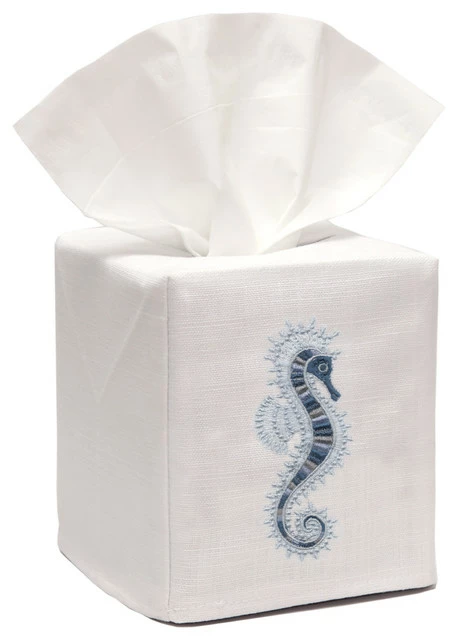 White linen tissue box cover embroidered with a Blue Seahorse. Slips perfectly over Puffs and Kleenex cubes. Made by Zulu women in South Africa