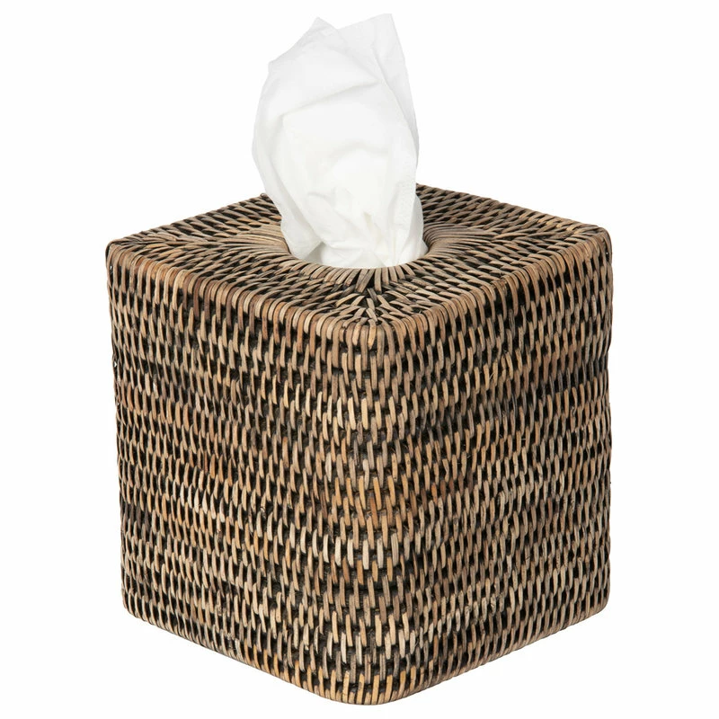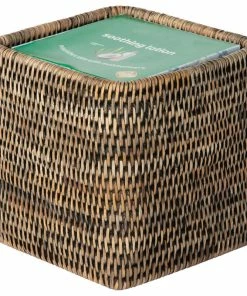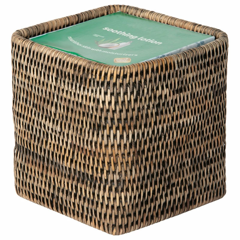 A pretty accent for any room, this rattan tissue box cover is hand woven with the rattan peel over the rattan vine in a rich honey-brown . This honey-brown rattan tissue box cover holds a standard cube-sized tissue box. Please measure the tissue boxes you are using and compare with the measurements of the tissue box cover hereafter to verify that one will fit into the other.