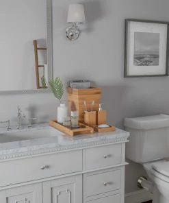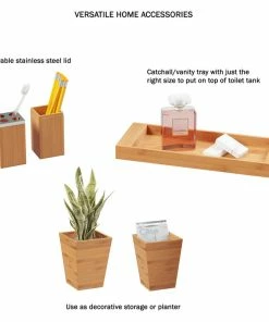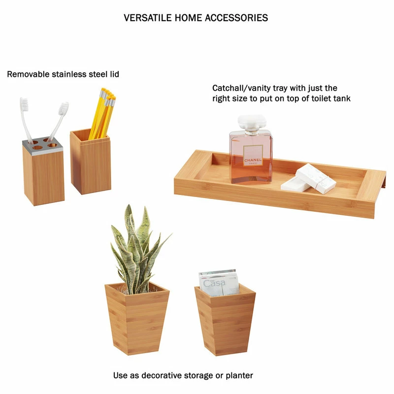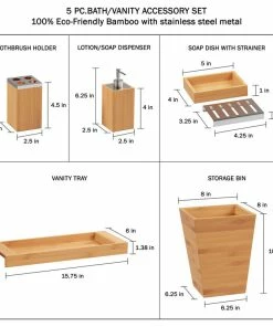 Form and function combine with the 5-Piece Bamboo Bathroom and Vanity Set by Lavish Home! The versatile set comes with a tray for hand towels, toiletries, jewelry or decorative items, a soap dish with a metal strainer, a soap or lotion dispenser, a toothbrush holder, and a waste basket that can also serve as an organizer bin. Constructed from sturdy natural bamboo, this clean-lined set is eco-friendly and bacteria resistant, and the pieces are all finished with a gloss lacquer to prevent water stains. The fresh and modern aesthetic of this bath accessory set is sure to complement any home dΓ©cor and will give a Zen spa-like feel to your bathroom.