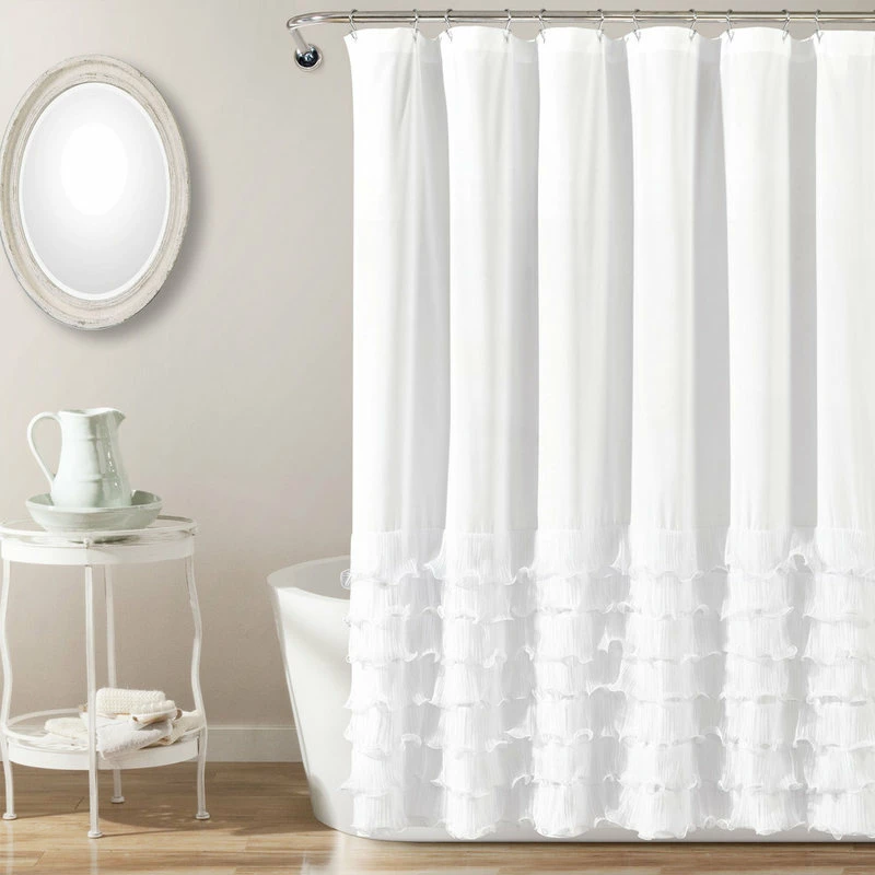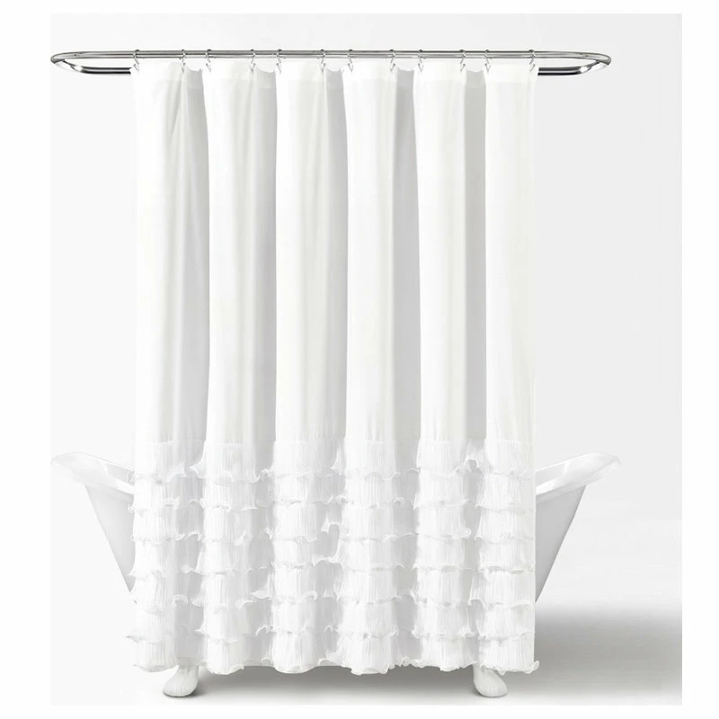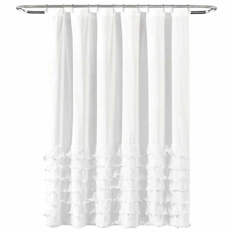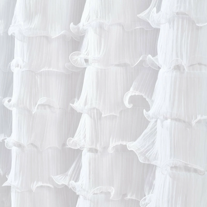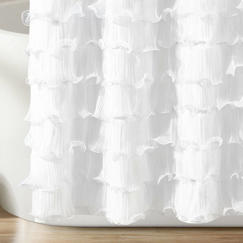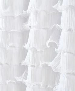 - Avery shower curtain features ripples of diaphanous tiers over soft micro fiber surface. Button holes on top allow quick installation. Measures 72×72.