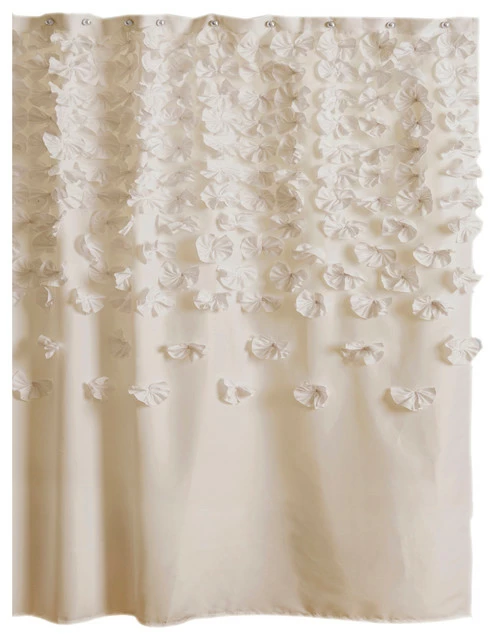 - Lucia shower curtain made with silky charmeuse decorated with all handmade flowers. It looks sophisticated and romantic.