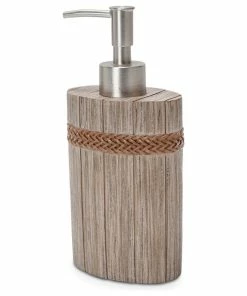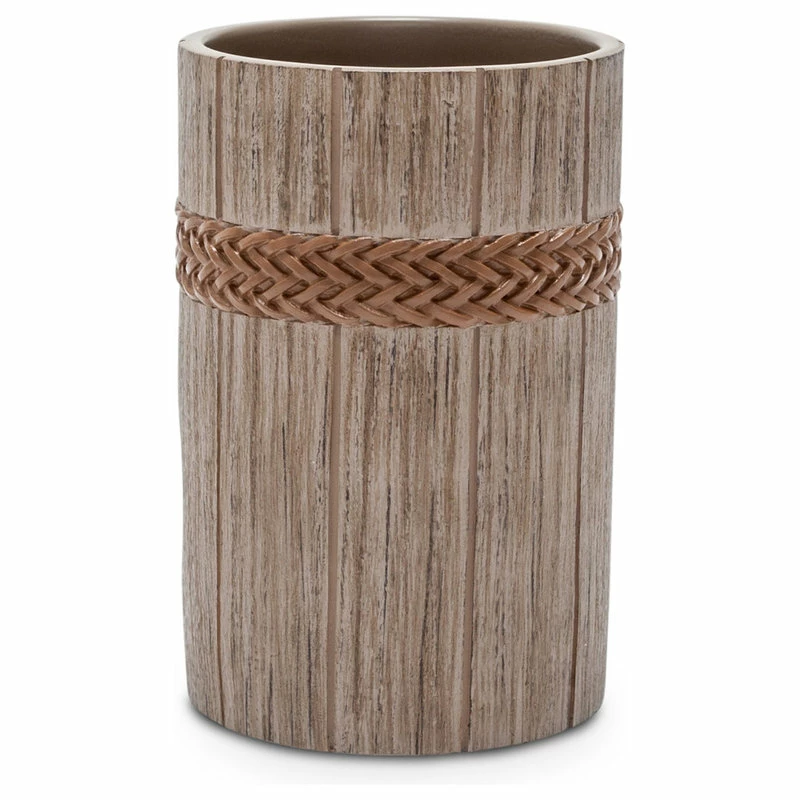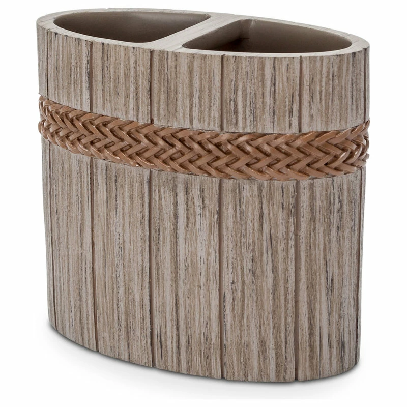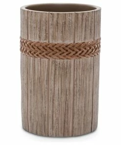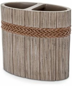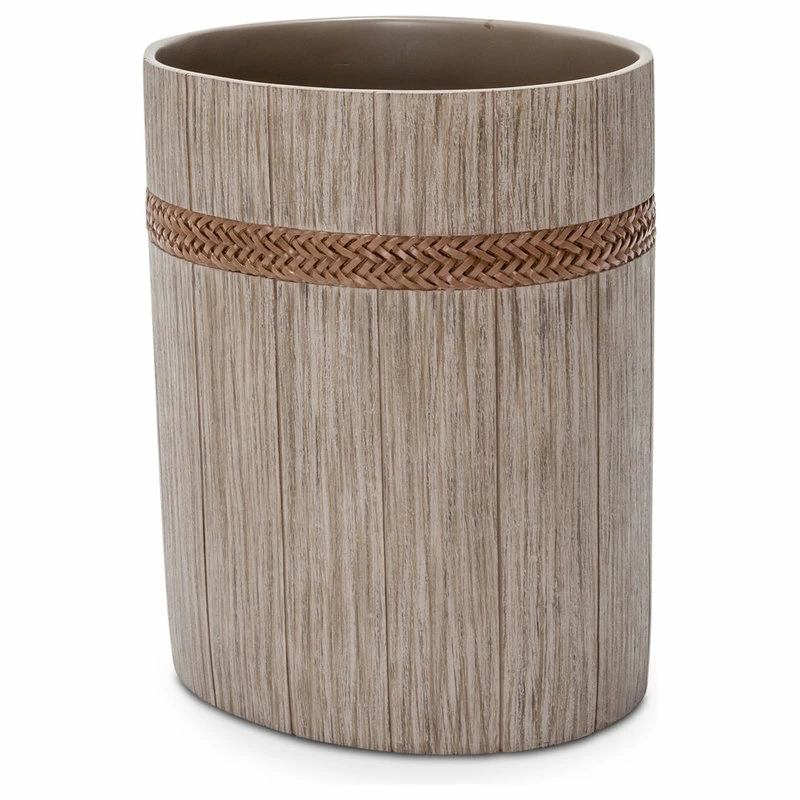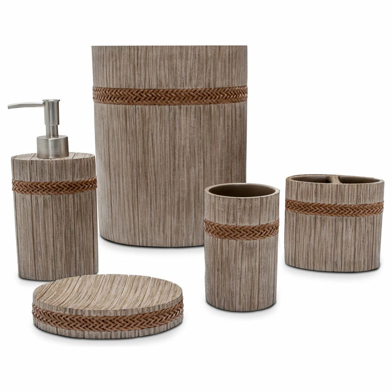 Carly is a trendy farmhouse style planked Bath Accessory Set. The rustic, simple, sensible style has a faux leather braided trim in warm wood tones.