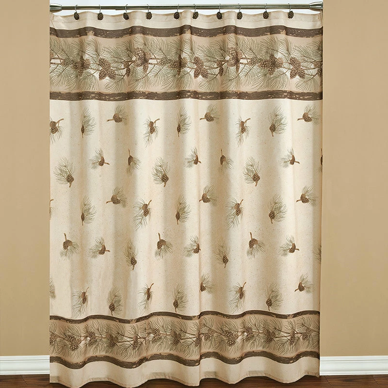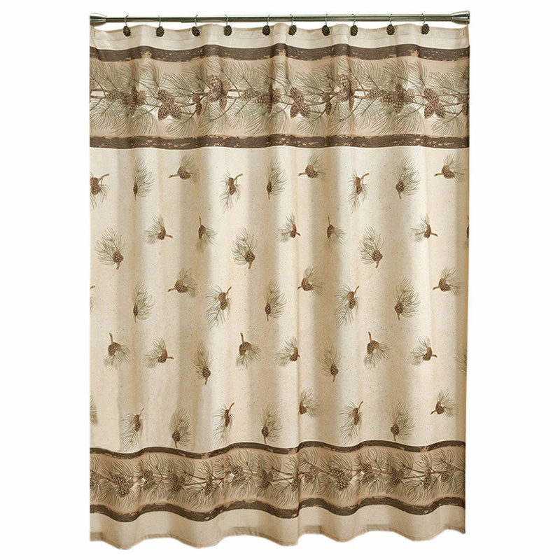 The Pinehaven fabric shower curtain by Saturday Knight Limited is 100% polyester. The printed design will give your bathroom a cabin’s feel. Whether you live in the woods or just wish you did, the pinecones and long needles of the evergreen will make your bathroom a cabin retreat.