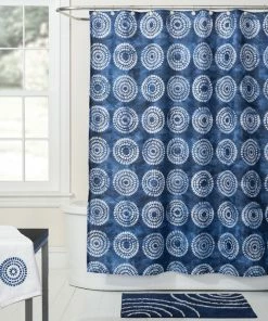 Waterfall shower curtain is printed polyester in a deep ocean blue with a repeating pattern of swirling white rings. A view from the base of a cascade; the Waterfall collection is full of swirls and ripples on deep blue palettes. Enjoy the serenity of the falling water with the entire waterfall collection.