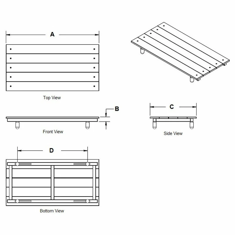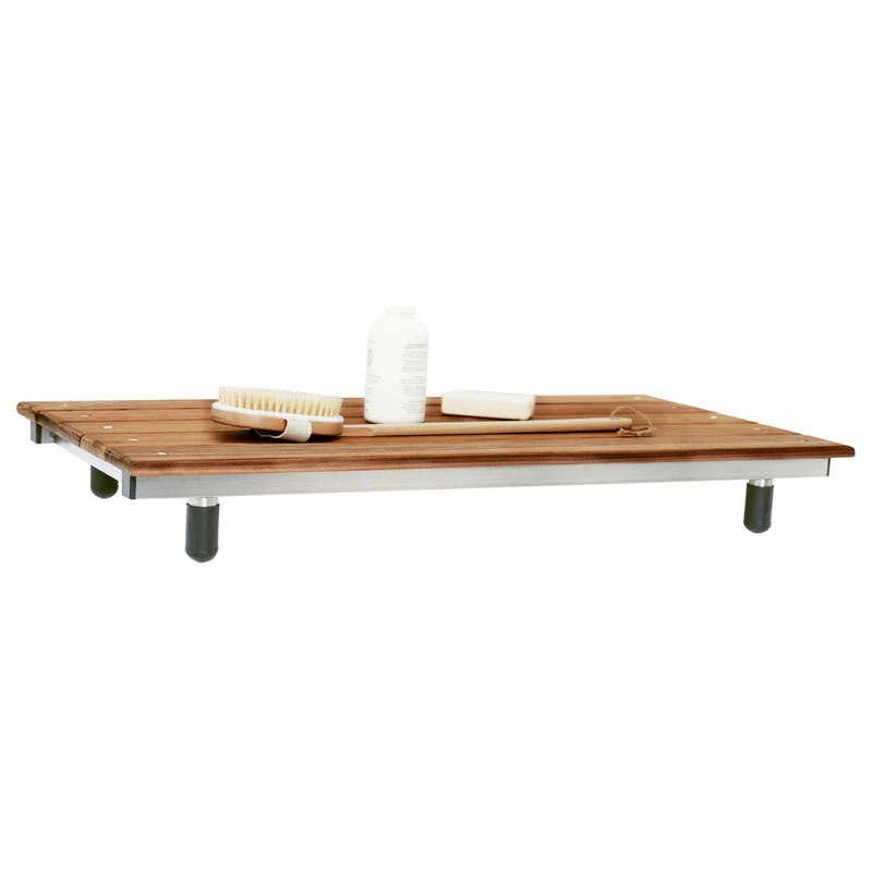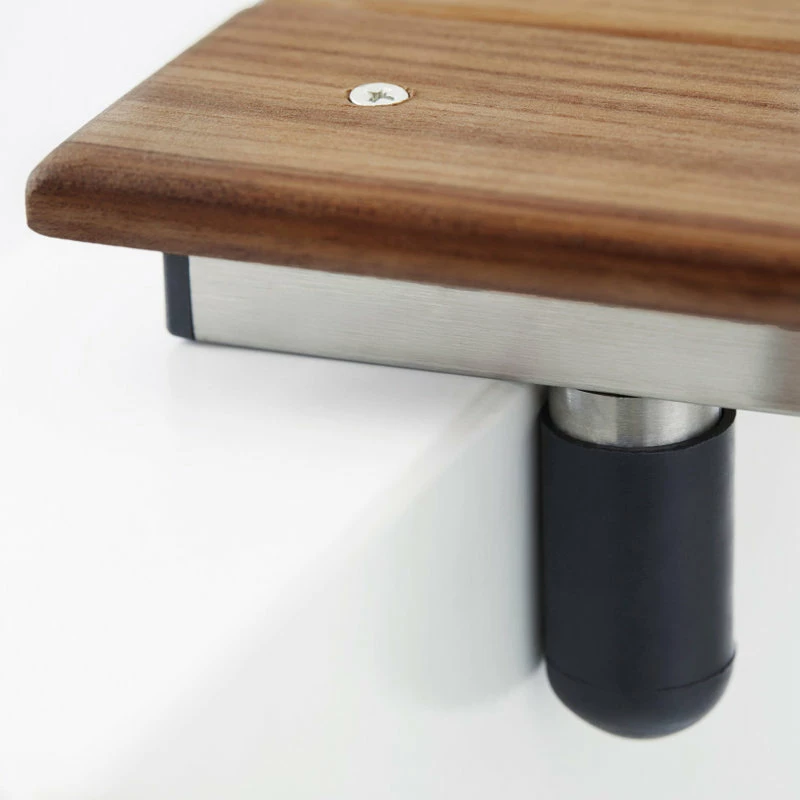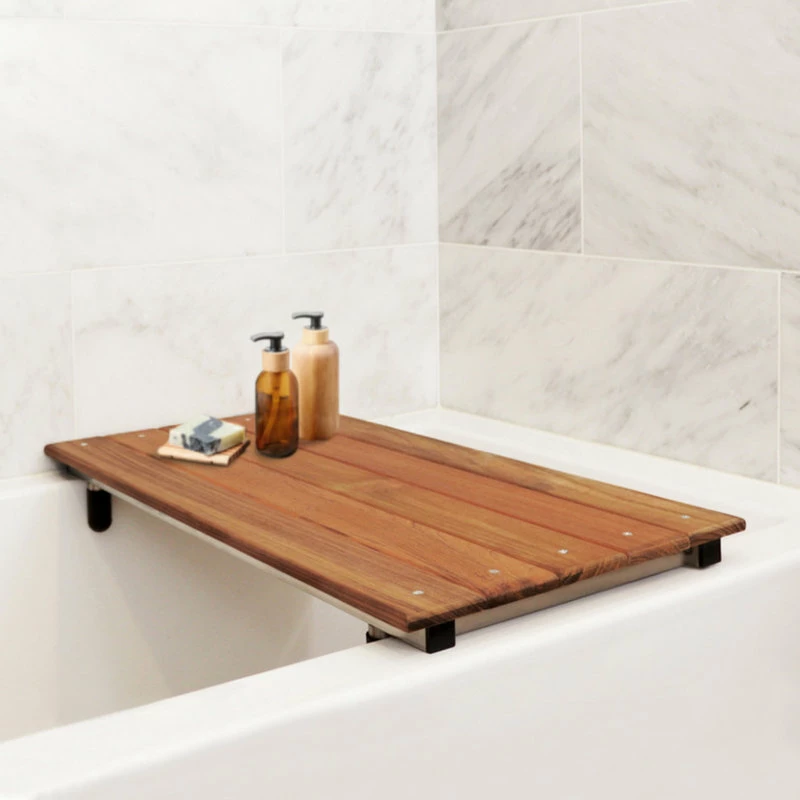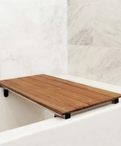 Seachromeโs Bridgeport Portable Tub Seat is designed to meet all your needs for safety, style and comfort. Its portable and adjustable design features enable this tub seat to rest securely on top of the tub dam, helping users to sit down in the tub without sliding. The tub seat is constructed to offer space-saving versatility and can be easily removed and stored away when not in use. Its wide seat surface supports up to 250 pounds and satisfies all ADA code requirements when properly installed. The Bridgeport tub seat is crafted with durable, water-resistant #304 stainless steel frame and natural teak wood slats ideal for long-lasting use. The wood slats are cut from the finest first European quality Burmese Teak and is 100% heartwood grade. Each seat has its own unique natural wood grain pattern. The tub seat also includes four adjustable posts that easily slide and lock in place, allowing the seat to fit within a wide variety of free-standing tubs.