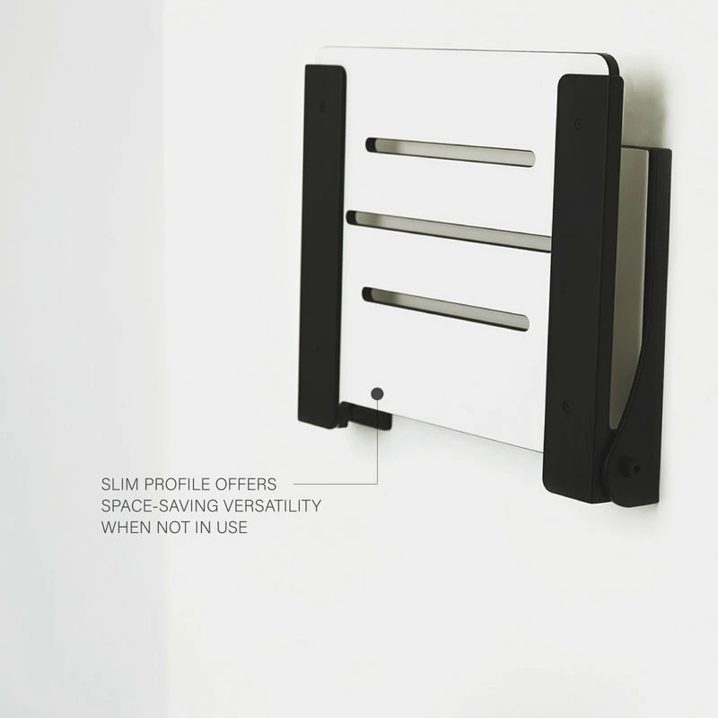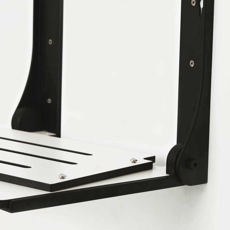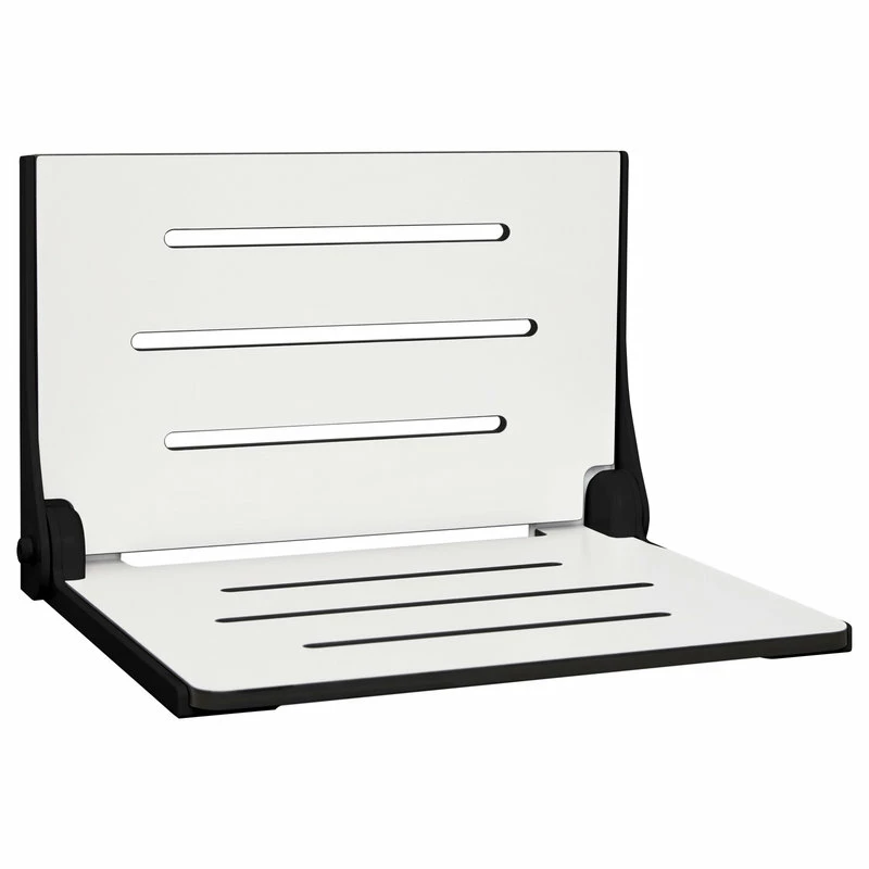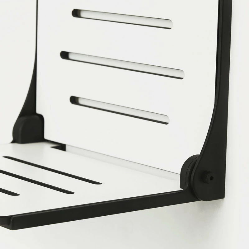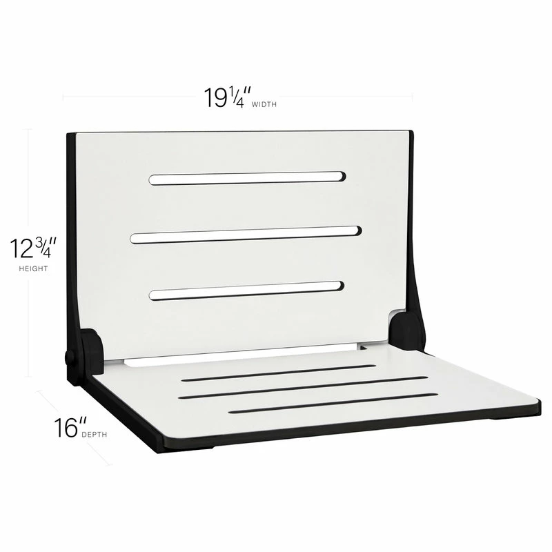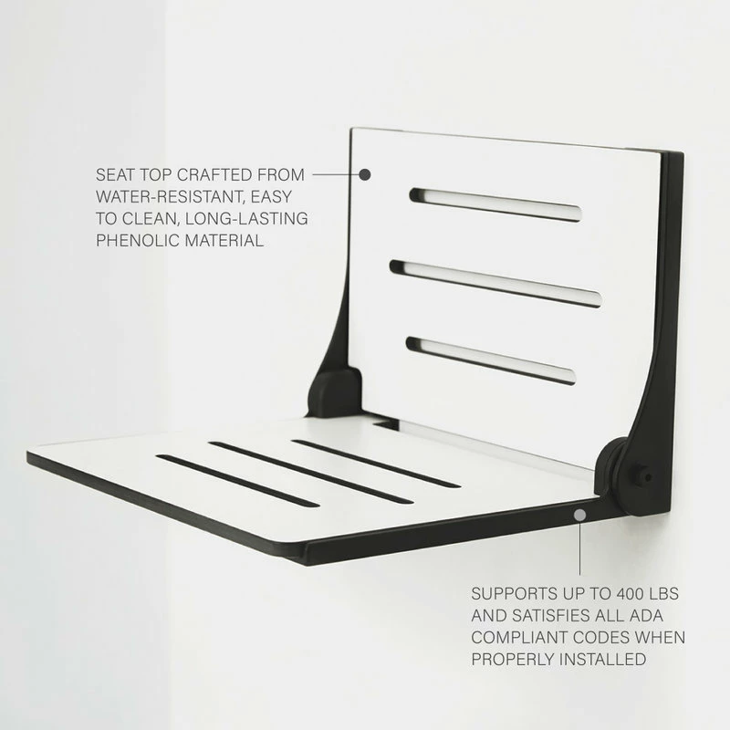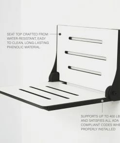Seachrome Lifestyle & Wellness® Silhouette SlimLine Shower Seat Line has a sleek minimalist spa-like design that brings a modern style and complements a wide range of bathroom décor styles. Our shower seats offer stability, comfort, and security to promote safety and peace-of-mind for all individuals. This sleek, slim seat folds within 3″ of the wall to provide space-saving security in the shower. Measuring 19.28†L x 16†W x 2.5†H, it is made from durable, water-resistant phenolic material with standard style drain slots and aluminum extruded frame ideal for long-lasting use in the shower or bath. There are multiple seat top Phenolic material options such as: Black, Teak, and White. Each Silhouette SlimLine Shower Seat supports up to 300 pounds and meets all ADA code requirements when properly installed. Mounting points have been spaced to be able to go directly into wood studs spaced 16″ apart. All Seachrome shower seats are certified for commercial/ residential use and proudly made in the USA with 100% recyclable materials and supports LEED compliance.