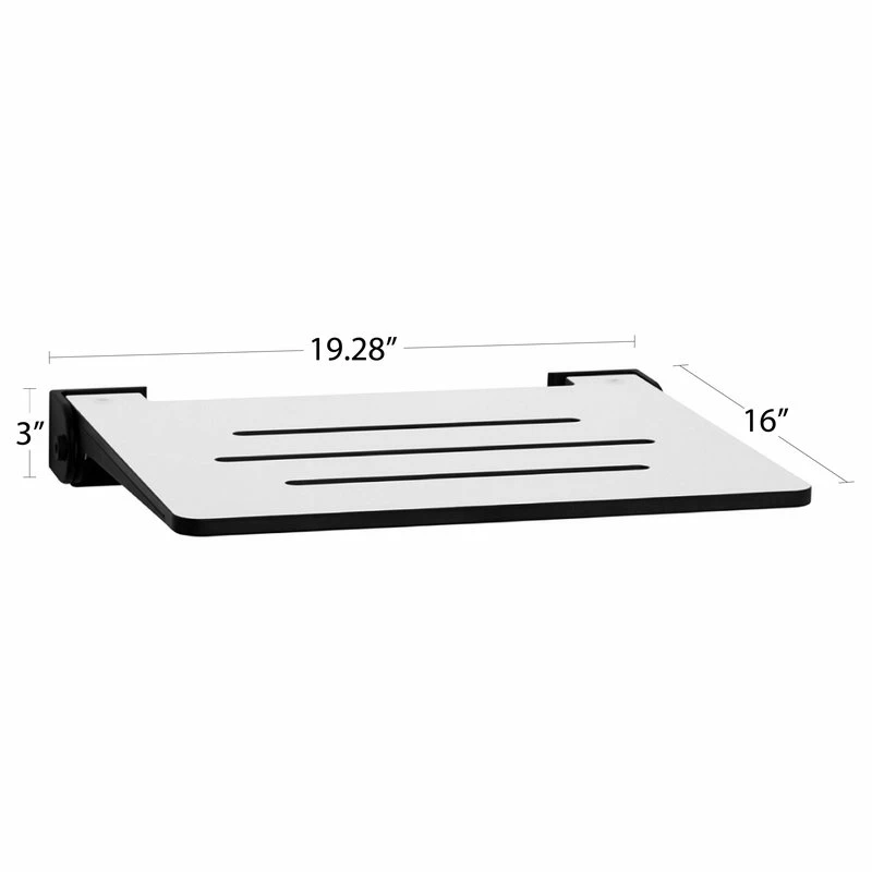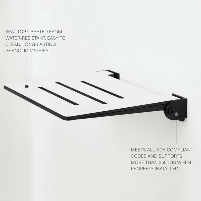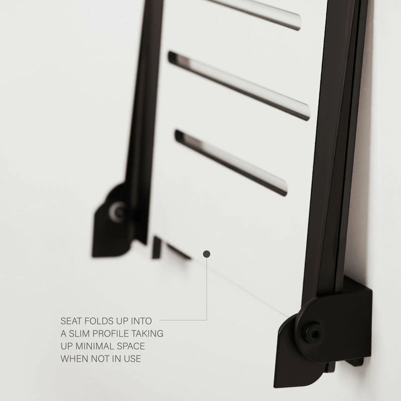Seachrome’s SlimLine shower seat has a sleek minimalist spa-like design measuring 19.28″ L x 16″ W x 2.5″ H and folds within 3″ of the wall to provide space-saving security in the shower. It is made from durable, water-resistant phenolic material with standard style drain slots and an aluminum extruded frame ideal for long-lasting use in the shower or bath, supports up to 350 pounds, and meets all ADA code requirements when properly installed. The SlimLine shower seat line offers many color top options such as Black, Teak, Grey, and White and is proudly made in the USA with 100% recyclable materials and supports LEED compliance.