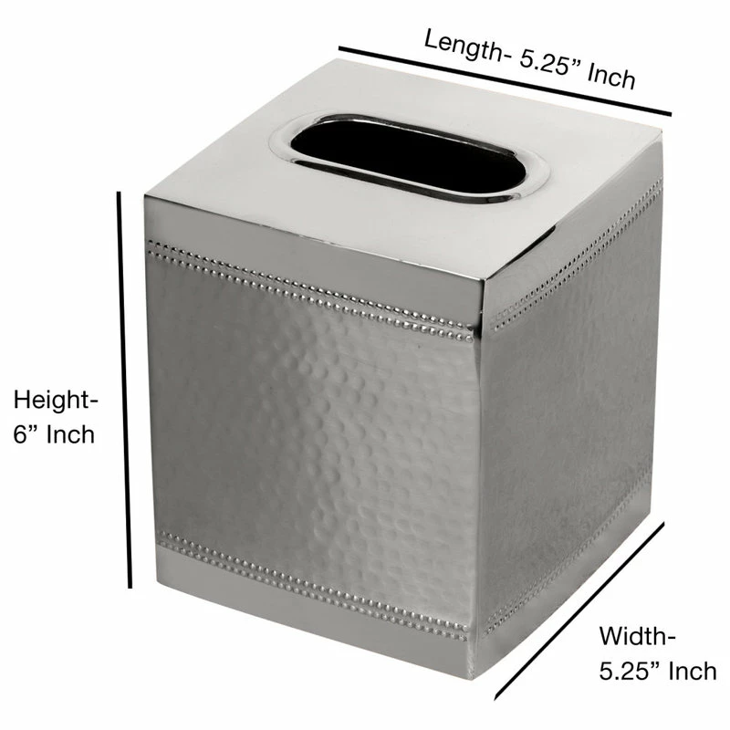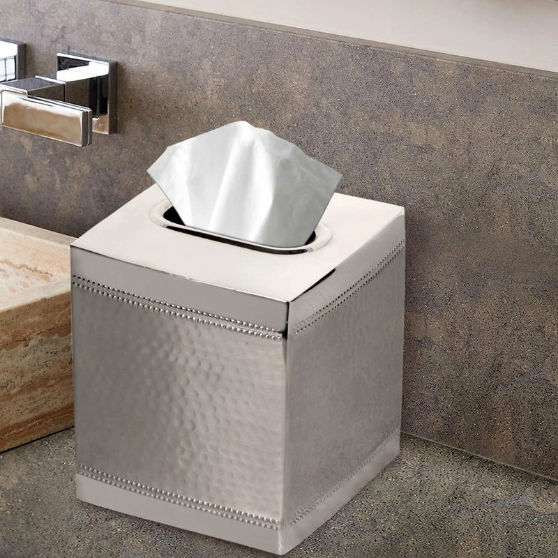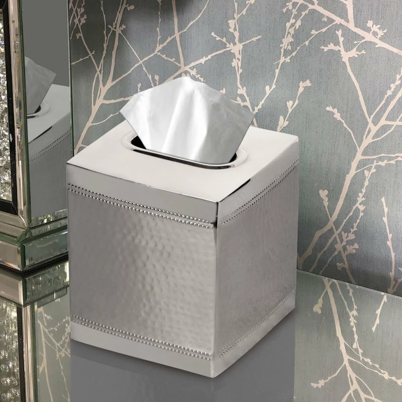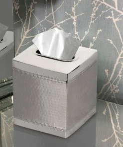 Turn a practical item into a pretty one using the Hudson Hammered Mirror Boutique Tissue Box Cover. Made from hammered stainless steel, this square tissue box is understated and sophisticated. Display it alongside other pieces from the Hudson Hammered Mirror bath collection for a cohesive look.