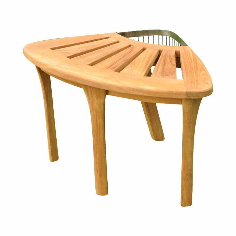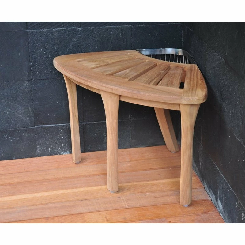Teak shower corner bench / Bath stool seat fits easily in a corner of the shower. Integrated stainless steel wire basket keeps shavers, creams, and essentials close at hand.