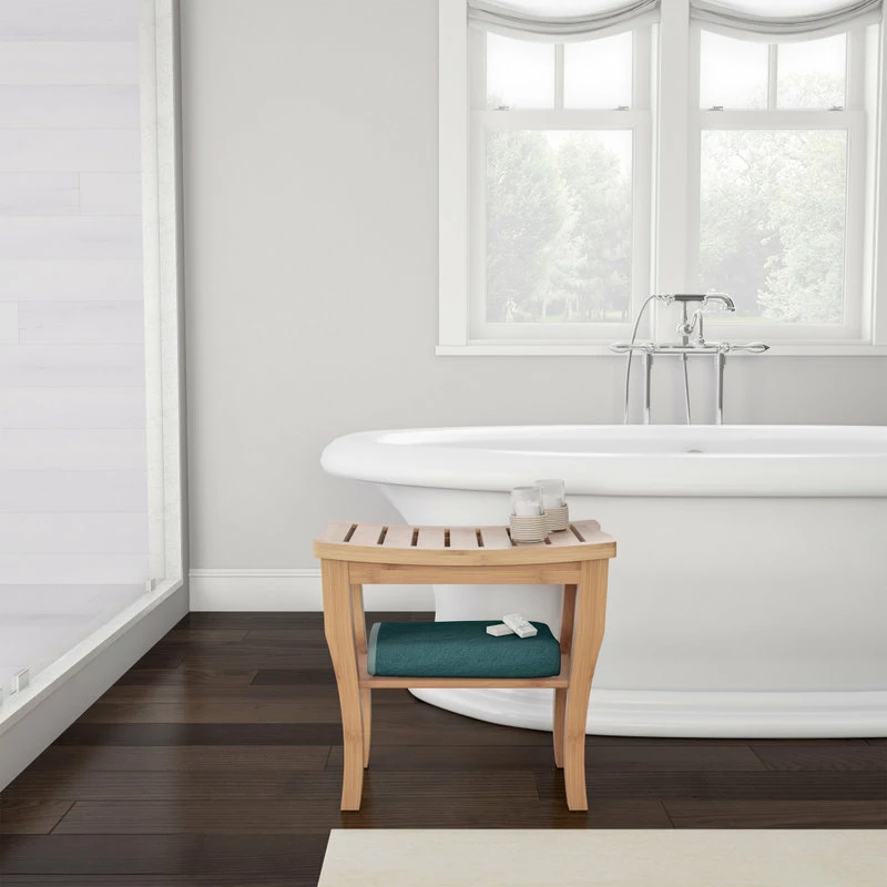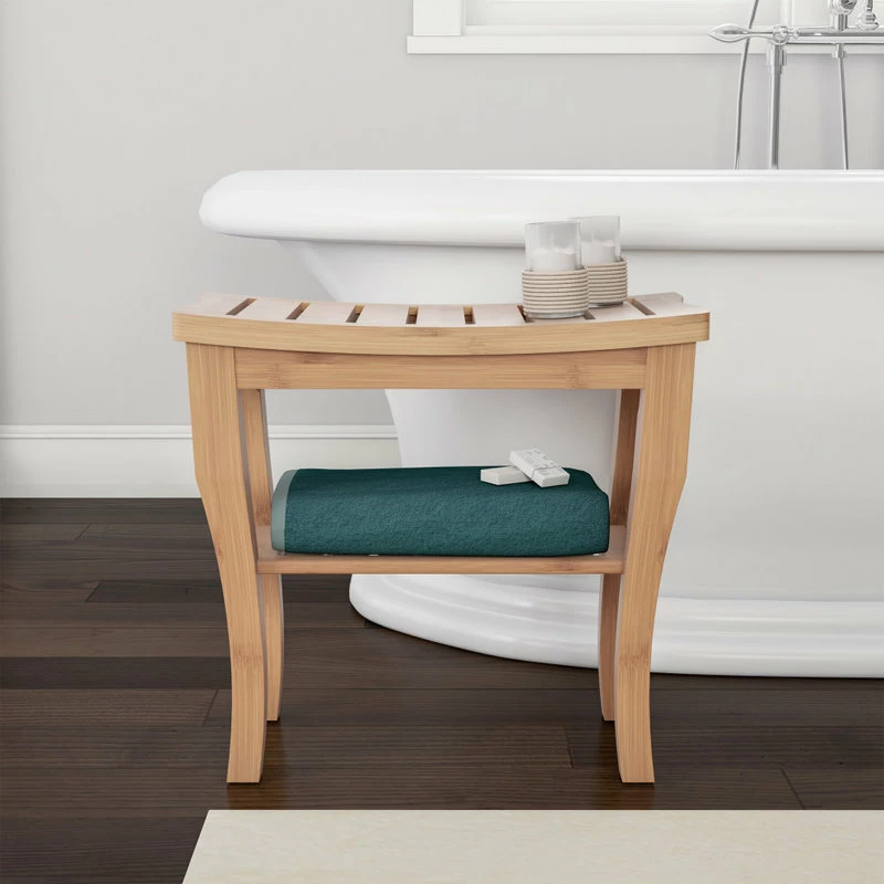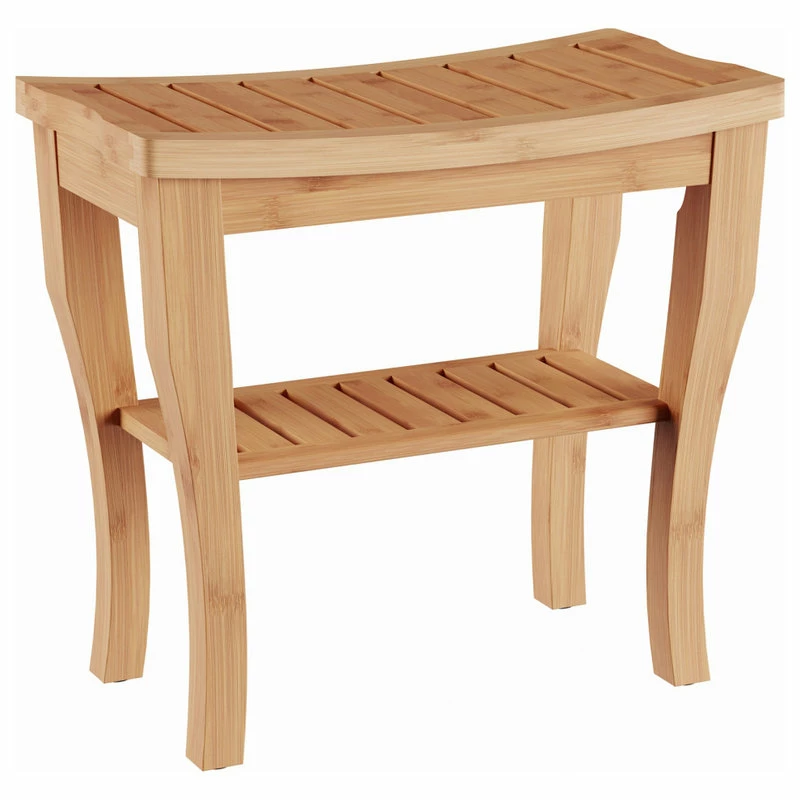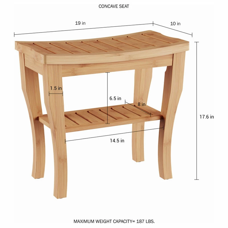 Create the perfect bath time setting with the Bamboo Shower Bench by Lavish Home. This versatile shower bench is made of 100% bamboo and is naturally bacteria and odor resistant. It features a glossy lacquer finish to help repel water stains. The sturdy seat has a concave shape for easy water flow to prevent build up and a slatted design for even air circulation. Crafted of sturdy bamboo, this stool has a maximum weight limit of 187 pounds to support the weight of most adults and children. The built-in storage shelf is great for keeping toiletries, towels, and other bath or shower accessories to keep them close at hand. This multi-functional bench is also great to use in the kitchen or bedroom, in dorms or small apartments. It has a small footprint, and is lightweight enough to take with you in the RV or on camping trips. The seat comes with all the hardware and tools for easy assembly.
