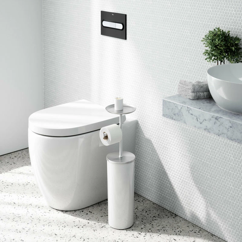 Freestanding and easy to move around, Portaloo makes use of vertical space to deliver a versatile and modern toilet paper stand. Portaloo’s practical design includes a built-in tray for personal items or small decor, as well as a reserve to hide and hold extra toilet paper rolls. Its white matte body and shiny chrome accents work to compliment bathroom appliances and suit a variety of color palettes. Portaloo is convenient, easy to use and fits up to three jumbo size rolls.