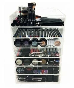 The OnDisplay Tiered Cosmetic Organizer neatly stores all your makeup in one simple and awesome design. Constructed of heavy-duty clear acrylic, the 7 Tier Cosmetic Organizer features 6 pull-out drawers each measuring 11.5″ wide and 11.5″ deep. The top level of the organizer has a lift-up lid to store frequently used cosmetics in a simple-to-access location. The entire unit measures about 12″ x 12″ x 18″ tall.